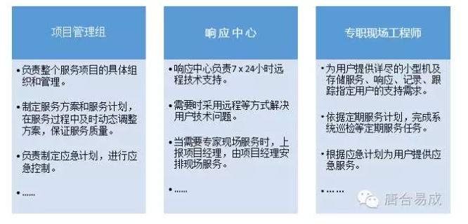 近期,我司凭借优异的技术实力和专业的IT运维服务,获得华东地区某金融保险企业的设备系统维护服务项目。针对用户的机器情况,我们将项目小组成员定为:项目管理组、响应中心、专职现场工程师、技术支持小组和应急管理组。项目管理组、响应中心、专职现场工程师主要职责如下: