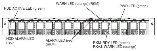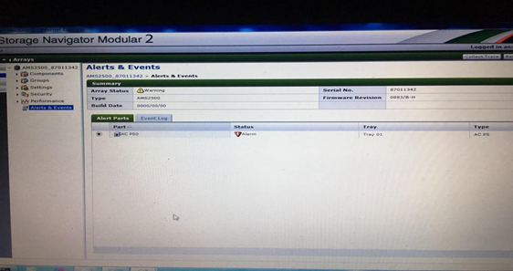 设备型号HDS AMS2500磁盘阵列前面板故障告警灯ALARM LED 红灯亮,同时设备后方的其中一个电源故障指示灯亮红灯。