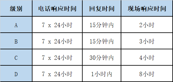 近期,我司凭借优异的技术实力和专业的IT运维服务,获得华北地区某工业生产企业的设备系统维护服务项目。经我司项目组工程师和客户协商后,将客户的故障响应级别定为: