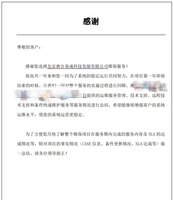 出具《年终服务总结报告》,对项目年度CASE信息、备件更换情况、SLA达成等做出全面总结,为下一年度提供优化意见。