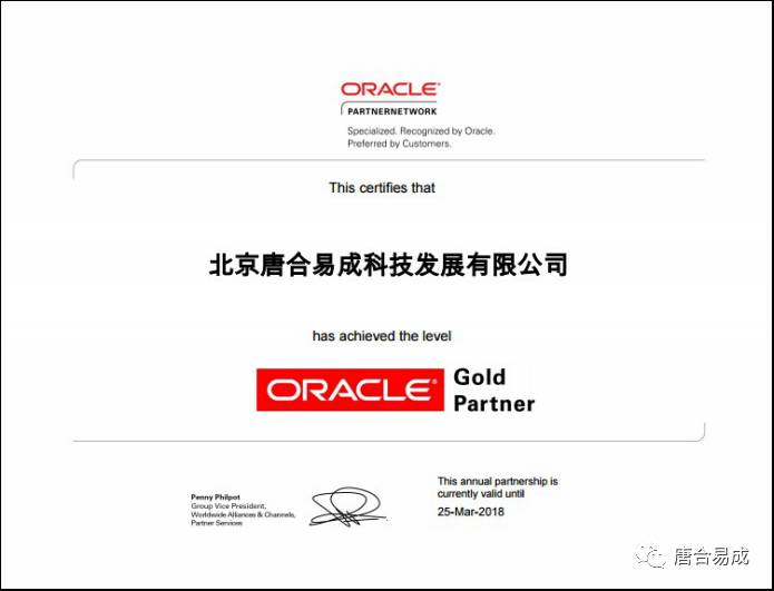 近期,唐合易成荣获ORACLE 金牌合作伙伴资格。作为金牌合作伙伴,唐合易成将具有: 可以经销完整的 Oracle 技术产品系列以及 Oracle 软件服务 (SaaS) 解决方案,让用户的应用程序获得 Oracle Exastack Ready 和Oracle Exastack Optimized 认证资格,并 可 经 销 所 有Oracle Applications、服务器和存储产品 ,我们还可以向客户提供 Oracle Financing 服务,获取开发许可,接收适用于技术产品或应用产品的软件更新和补丁。