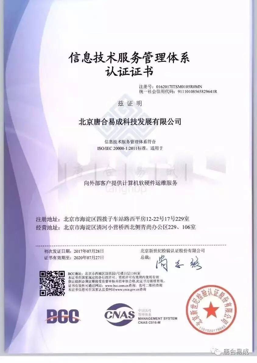 唐合易成荣获ISO20000信息技术服务管理体系认证