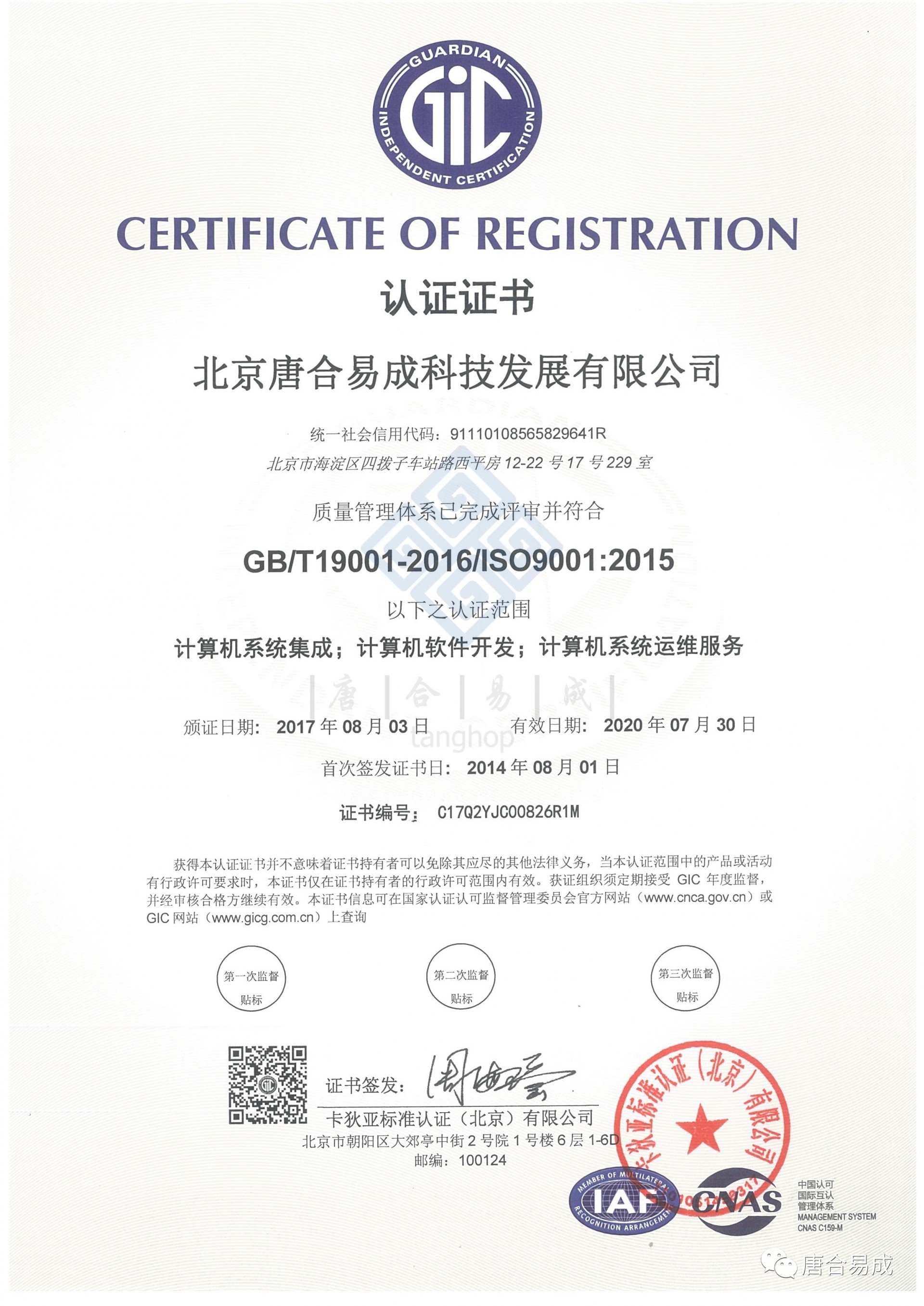 唐合易成获得 ISO9001 质量管理体系再认证 2020-01-10 18:23