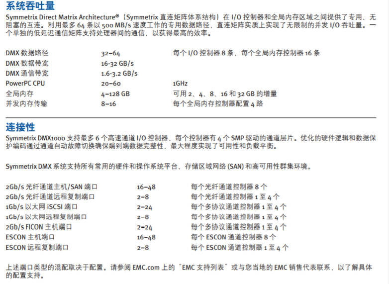 EMC Symmetrix DMX1000 作为高端存储产品,采用单机架存储系统,它最多可以配置 144个2Gb/s 高性能光纤通道磁盘驱动器,提供的最大裸容量超过59TB。12 插槽的 Direct Matrix(直连矩阵)底板提供的配置包括:多达4个全局内存控制器,多达6个通道I/O 控制器,以及2或4个专用磁盘I/O控制器。简要描述如下:
