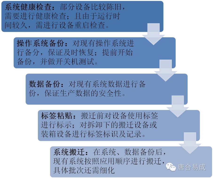 在搬迁的过程中,由于各业务系统之间存在依存关系,搬迁要按照特定顺序进行,分批次,我们为用户制定了主要的搬迁流程和具体的机器搬迁流程,保证了搬迁项目的圆满完成。