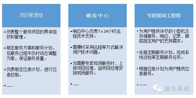 近期,我司凭借优异的技术实力和专业的IT运维服务,获得华东地区某金融保险企业的设备系统维护服务项目。针对用户的机器情况,我们将项目小组成员定为:项目管理组、响应中心、专职现场工程师、技术支持小组和应急管理组。项目管理组、响应中心、专职现场工程师主要职责如下: