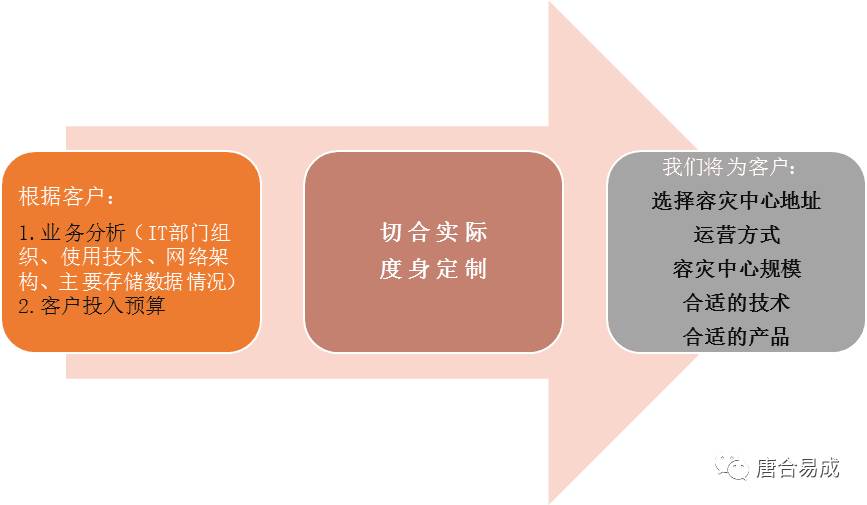 唐合易成在容灾备份方面有多年服务经验,我们将根据客户的具体业务要求,设置具体的灾备方式: